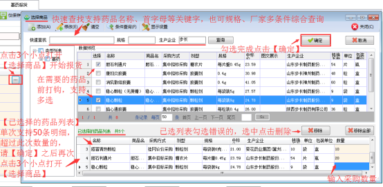 方案二:在【選擇商品】頁(yè)通過(guò)【快速查詢】檢索需要的藥品,在選擇框打鉤,重復(fù)此動(dòng)作;勾選的藥品在下方的:已選擇的藥品列表;已選列表最后一欄的數(shù)量,直接輸入采購(gòu)數(shù)量;勾選錯(cuò)誤的藥品,選中該藥品點(diǎn)擊【刪除】按鈕;勾選完成點(diǎn)【確定】;