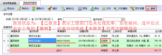 提交并保存則該單報(bào)貨數(shù)據(jù)自動(dòng)提交至上級(jí)部門,進(jìn)行下一步的處理;